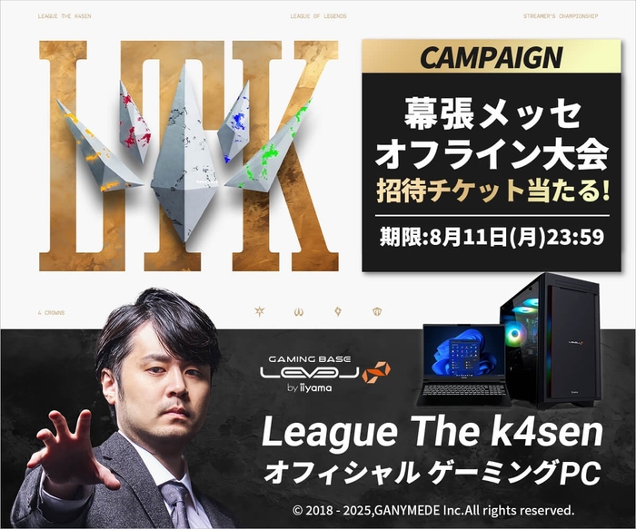 パソコン工房・グッドウィルを運営する株式会社ユニットコム(代表取締役:端田 泰三、本社:大阪市浪速区)は、iiyama PC ゲーミング PC シリーズ「LEVEL∞(レベル インフィニティ)」より、League The k4sen オフィシャル ゲーミングPC販売中。また、抽選で合計10名様に「League The k4sen」幕張メッセオフライン大会招待チケット(アップグレードチケット)プレゼントキャンペーンを2025年8月4日(月)から実施いたします。