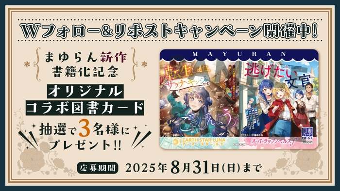 オーバーラップノベルスfとアース・スター ルナの公式XをWフォローし、該当ポストをリポストすると抽選で3名にコラボ記念図書カード3000円分が当たる。さらに、現在発売中の「転生しました、サラナ・キンジェです。ごきげんよう。~婚約破棄されたので田舎で気ままに暮らしたいと思います~」最新4巻と8月25日発売の「逃げたい文官 奪われ続けてきた不遇な少女は、隣国で自由気ままに幸せな生活送ります」のそれぞれに、クロスオーバーの書き下ろしショートストーリーが掲載された投げ込みチラシが封入されている。