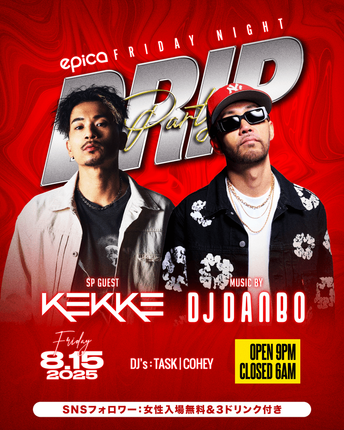 株式会社SEQUENCE(代表取締社長:高田 一司)が運営する「エピカ・沖縄」(所在地:沖縄県那覇市松山1-5-1 ナムラプラザビル3F)は、2025年8月15日(金)、【DRIP】にスペシャルゲスト、DJ KEKKEを迎え開催する事が決定致しました。