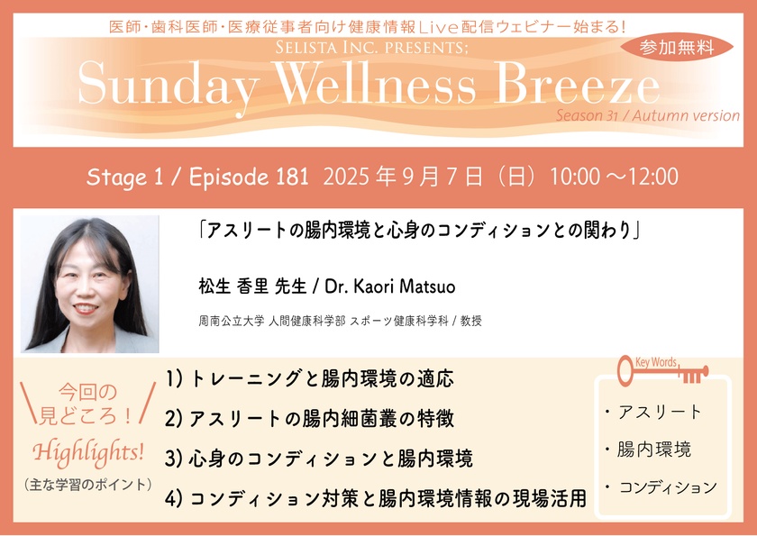 セリスタ株式会社(東京都千代田区 代表取締役 伊藤 承正)は、2025年9月7日(日)に、松生 香里 先生(周南公立大学 人間健康科学部 スポーツ健康科学科/教授)を講師にお迎えし、医師・歯科医師などの医療従事者向け無料Zoomオンラインセミナー『アスリートの腸内環境と心身のコンディションとの関わり』を開催します。
