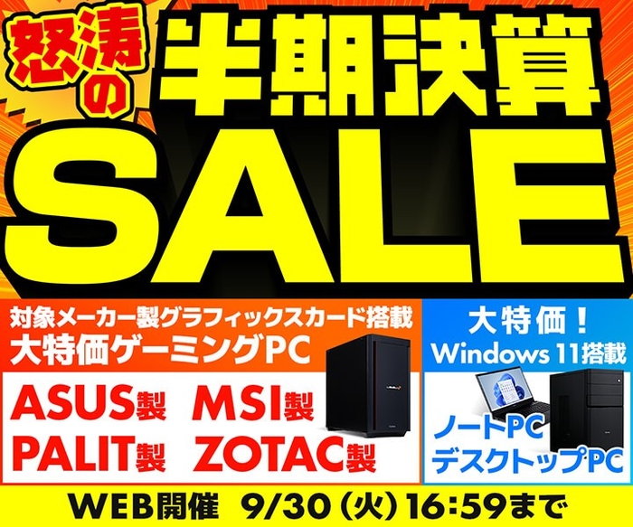 パソコン工房インターネット通販ではただいま『怒涛の半期決算SALE』を9/30(火)16:59まで実施中!