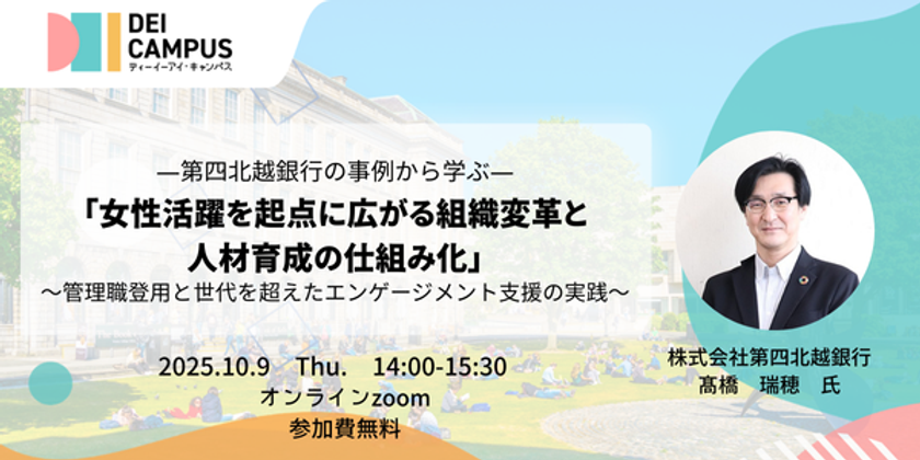 企業・団体の“ダイバーシティ、エクイティ&インクルージョン”(以下、DEI)の推進を支援する株式会社wiwiw(本社:東京都新宿区、代表取締役社長:佐藤 歩美)は、企業内でDEIスペシャリストを育成し、組織のDEI推進を加速するサービス「DEI Campus」の一環として、2025年10月9日(木)14:00から、人事・労務向け事例セミナー『第四北越銀行に学ぶ 「女性活躍を起点に広がる組織変革と人材育成の仕組み化」』を開催いたします。