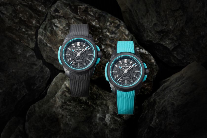 本モデルのベースとなっている「ワイルドワン」は、ノルケインが“究極のスポーツウォッチ”と位置付けるコレクションです。独自開発のカーボン複合素材「ノルテック」をミドルケースの上下で挟み込み、ラバー製ショックアブソーバーを組み込んだ革新的なケース構造により、5000Gもの衝撃に耐える驚異的な耐衝撃性を実現。さらに、200mの防水性能も備えており、小歩危で盛んに行われているラフティングのような激しいウォータースポーツにも対応する、圧倒的なタフネスを誇ります。