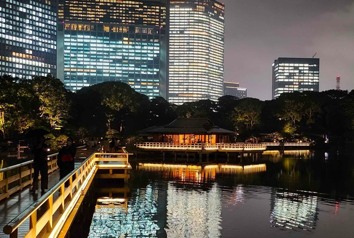 浜離宮恩賜庭園では、本日10月31日(金)から11月5日(水)までの6日間、十三夜に合わせて、「浜離宮でお月見散歩~将軍の御庭で栗名月を愛でる~」を開催します。通常は入園できない夜21時まで開園時間を延長し、園内をライトアップします。今年は「お伝い橋」の修復工事のため、今回だけの特別なルートで夜の景観をご覧いただけます。