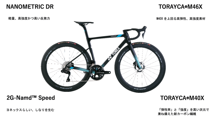 ヨネックスが長年培ってきたカーボン加工技術により、多様な高機能素材を最適な部分に配置。空力性能に重要な箇所には高剛性素材「トレカ®M40X/M46X」や「NANOMETRIC DR」を、しなり性能には「2G-Namd™ Speed」を採用し、空力・剛性・軽量化を高次元で調和させています。