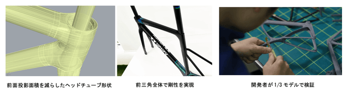 開発では、空力性能を最重要テーマに掲げ、複数の形状試作と風洞試験を重ねて設計。特に重要なヘッドチューブは前面投影面積を減らすため前方に尖った形状を採用しました。さらにダウンチューブとトップチューブは細身設計により空気抵抗を最小限に減らしつつ、軽さと剛性を最適化し、未塗装フレーム重量680g※1を実現しています。