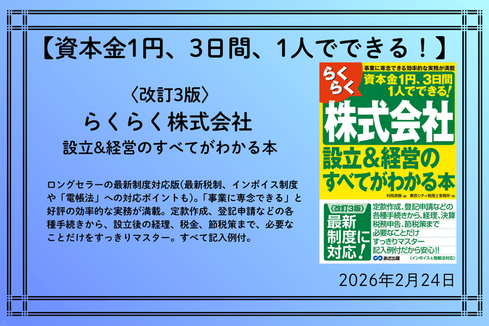 株式会社あさ出版(代表取締役:田賀井弘毅、所在地:東京都豊島区)は村岡 清樹 編 東京シティ税理士事務所 著『〈改訂3版〉らくらく株式会社設立&経営のすべてがわかる本』https://www.asa21.com/book/b627559.html を2026年2月24日(火)に刊行いたします。