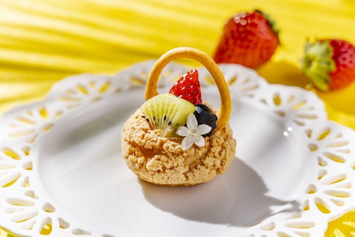 バスケットのかごをイメージしたクッキーシューの中にカスタードクリームを絞り、苺、キウイ、ブルーベリー、エディブルフラワーを彩り豊かにのせました。シェフの遊び心あふれる、目にも鮮やかな一品です。