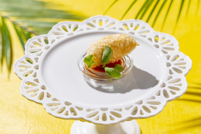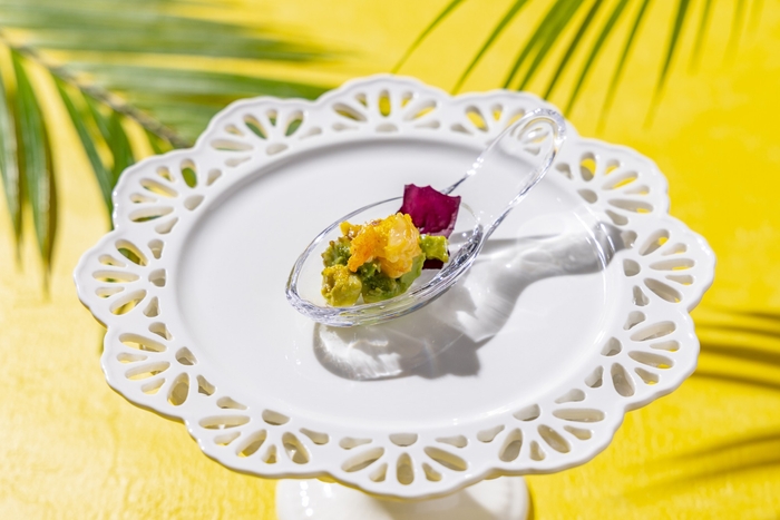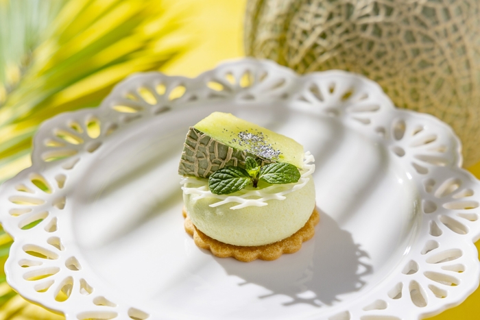 今回のアフタヌーンティーでは、マンゴーやメロンなどの人気フルーツに加え、枇杷(びわ)やパッションフルーツなど13種類のフルーツを使用したメニューが揃います。マンゴーとココナッツの2層のプリン上に完熟マンゴーを飾った贅沢なパフェや、メロンの網目を模したホワイトチョコとアールスメロンを飾ったメロンとバニラのムース、芳醇な枇杷(びわ)を飾ったレアチーズケーキなど、こだわりが詰まった7種がラインナップ。セイボリーでは、旬のズッキーニをかつお節ベースの和だしジュレで味わうカルパッチョ、磯の香りとタケノコの食感が楽しいアランチーニなど、初夏の息吹を感じる6皿をご用意いたしました。