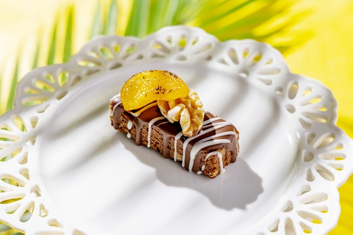 アーモンド、クルミ、アプリコットをたっぷりと加えて焼き上げたスティックブラウニー。ミルクとダーク、2種のチョコレートを纏わせ、バーナーで炙ったアプリコットとローストクルミをトッピングした、香ばしさと果実の甘みが際立つ一品です。