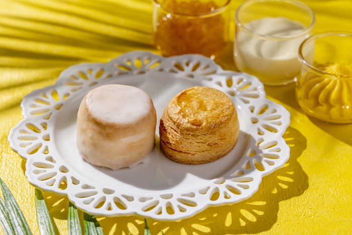 定番のプレーンスコーンに加え、レモンのコンフィを練り込んで焼き上げ、レモンシュガーをまとわせた爽やかなスコーンをご用意しました。なめらかなクロテッドクリーム、甘夏みかんをトマトと一緒に炊き上げたジャム、パッションフルーツの爽やかな香りが際立つリリコイバタークリームを添えてご提供します。