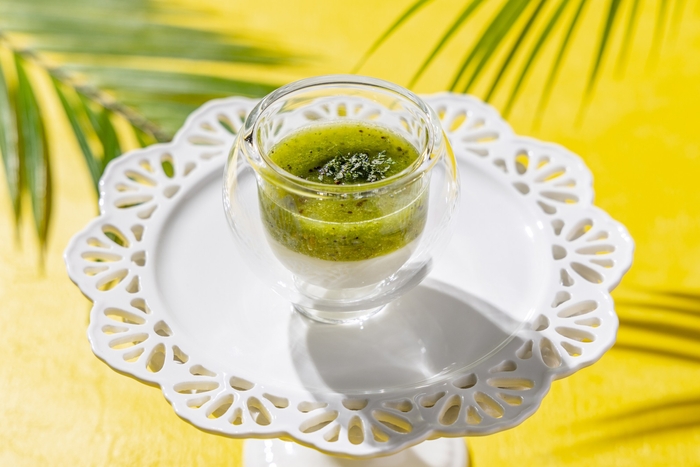 酸味が効いたキウイフルーツにルッコラのほのかな苦みを合わせたグリーンスムージーと、蜂蜜ヨーグルトを2層仕立てにしました。爽やかさと甘みが溶け合う一杯です。