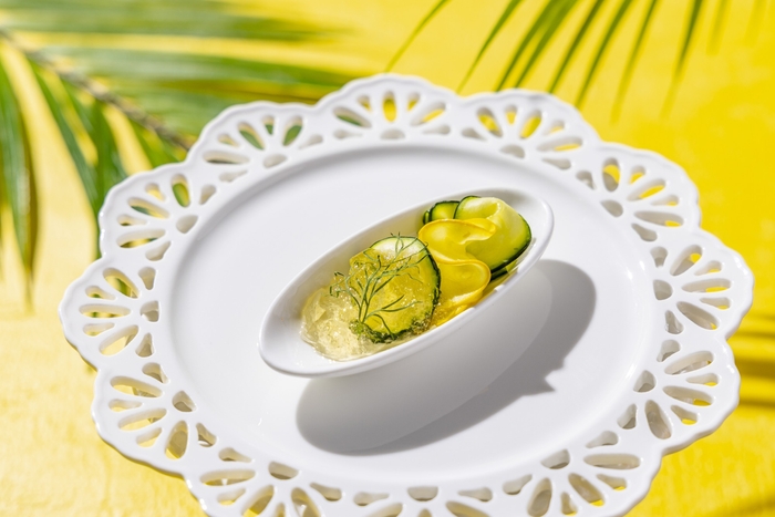 旬のみずみずしいズッキーニに、かつお節ベースのジュレを添えた初夏らしい一品。和と洋の素材を融合させた繊細な味わいが、清涼感を運びます。